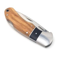 Klassisches Haller Taschenmesser mit Rückenverriegelung. Als Griffmaterial werden Olivenholz und Micarta hergenommen.