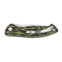 Die besonders hochwertige Verarbeitung dieses Herbertz Top-Collection Einhandmessers wird dem Besitzer viel Freude bereiten. Die satinierte Klinge aus rostfreiem AISI 440 Hochleistungsstahl kann dank des eingebauten Kugellagers an der Klingenachse über einen Flipper spielend leicht geöffnet werden. Für ein daumenfreundliches Lösen der Arretierung wurde der Liner Lock ergonomisch abgeschrägt. Beim Griffmaterial wird optisch ineinander verlaufendes G10 in Grün und Schwarz eingesetzt. Die Strukturierung der Heftschalen sorgt zusätzlich für guten Halt. Eine verdeckte Fangriemenöse und ein Edelstahl Gürtelclip sind ebenfalls vorhanden. Die Lieferung erfolgt mit Nylonetui und Kunststoffbox.